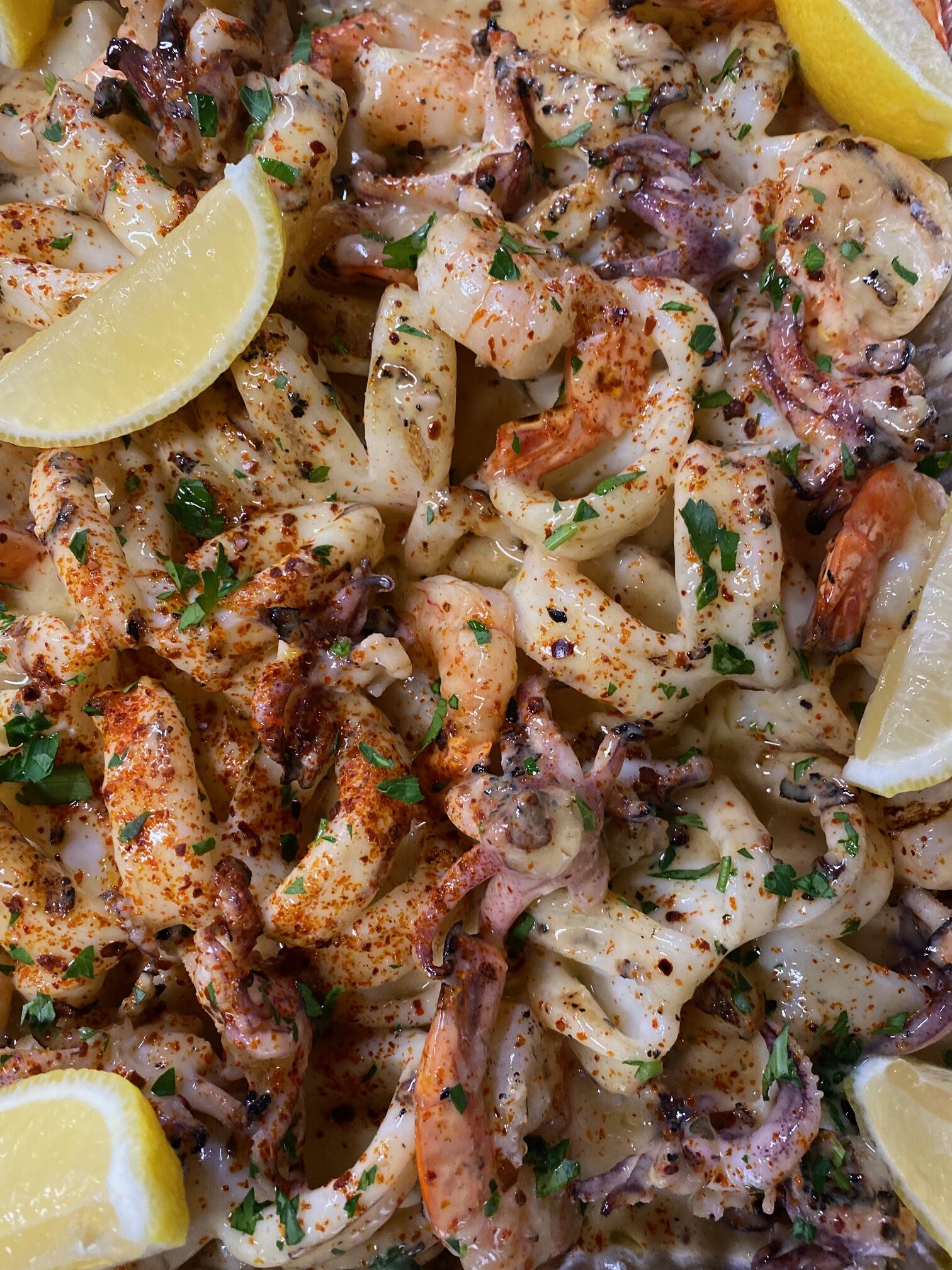 Grilled Calamari & Shrimp half pan serves 7-8 people